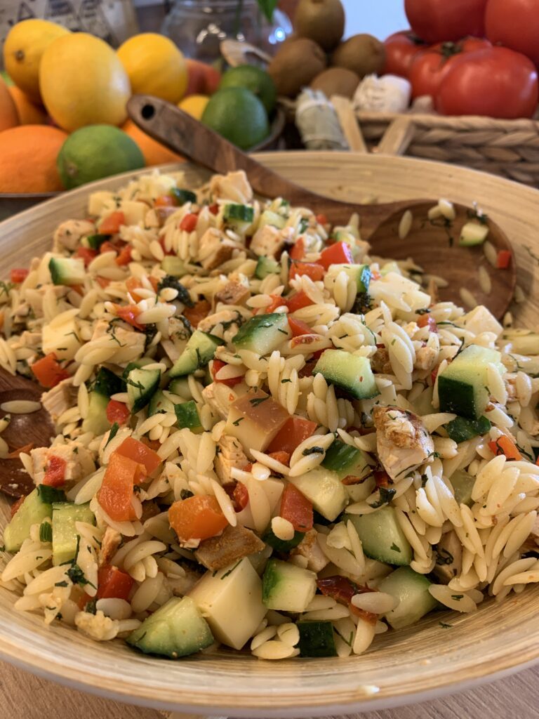 - W dużej misce połącz: wystudzony makaron orzo, indyka, paprykę, ser, ogórek i koperek.